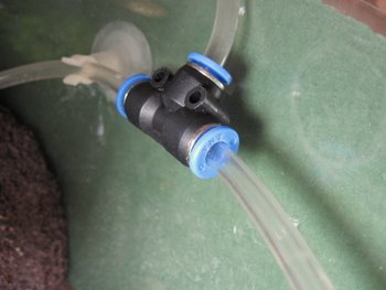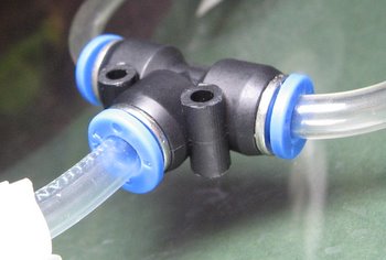 Sedan sätter man slangen i en koppling som den här. Det finns även andra i olika utföranden. Från dessa kopplar man de sista slangarna som ska gå till var och en av dysorna. Man kan även sätta slangar mellan flera olika kopplingar för att kunna koppla in fler dysor. (om ni förstår vad jag menar) :)