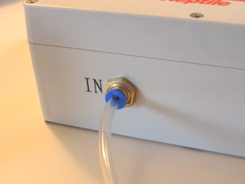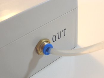 På andra sidan av pumpen står det OUT. Där kopplar man in slangen som ska in i vivariet.