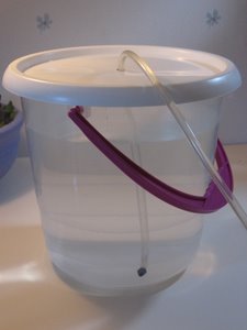Ofta ingår det ett vattenkärl av något slag men i mitt fall var den sönder när den kom så jag köpte in hink med lock därefter gjorde jag ett hål i locket. Sedan trär man slangen ner genom hålet och sätter dit ett litet filter. (pluppen längst ner) :)